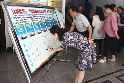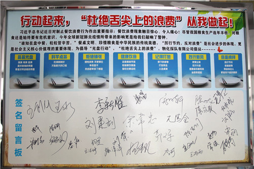 随后,班子成员带头,全体党员在“积极行动起来,'杜绝舌尖上的浪费'从我做起!”的签名留言宣传展板上纷纷签上了自己的名字。通过此次活动,进一步在全体党员干部、职工中增强了勤俭节约、反对浪费的思想意识。大家纷纷表示,从我做起、从点滴做起,做到珍惜粮食、拒绝浪费,自觉作勤俭节约风尚的传播者、实践者和示范者,以实际行动为建设节约型社会做出积极贡献。”