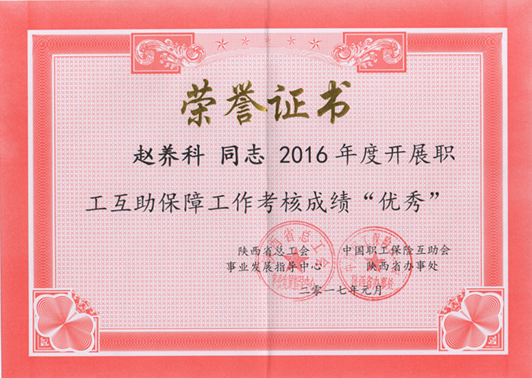 2017年1月13日,在陕西省职工互助保障工作会议上,对2016年度在陕西省职工互助保障工作中成绩突出的先进单位和优秀个人进行了表彰,我队工会被陕西省总工会事业发展指导中心和中国职工保险互助会陕西省办事处联合授予“先进集体”荣誉称号,授予工会主席赵养科同志“优秀个人”荣誉称号。