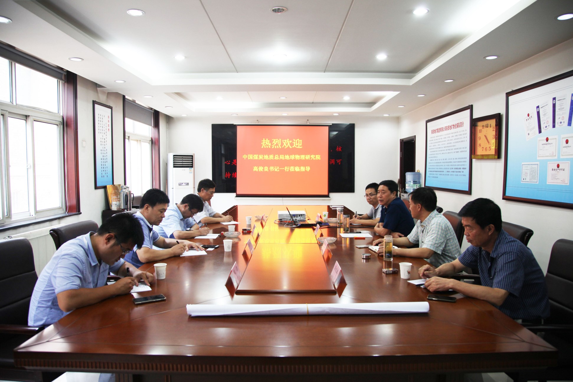 8月1日,中国煤田地质总局地球物理研究院党委书记高俊良一行4人来物化探队进行考察调研与交流。物化探队领导王新坪、余常忠、刘建利参加座谈交流。